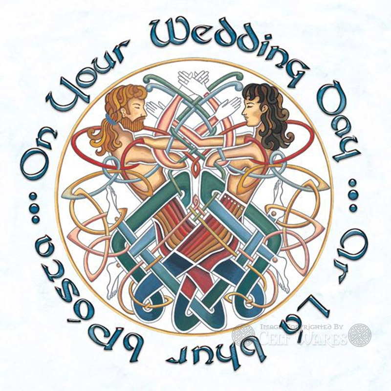 Wedding Greeting Card, with Celtic design, featuring Diarmuid & Grainne interwined in a colorful Celtic Knot.